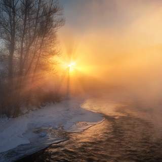 Сентябрь в пору своего многоцветья: прозрачны речные зелено-синие воды, белым отливает жухлая прибрежная трава в инее, под ногами всполохи красно-бордовых кустиков барбариса, а со всех сторон окружают пушистые лиственницы на разных стадиях пожелтения.