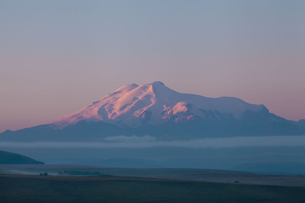 Эльбрус освещенный самыми первыми лучами солнца на рассвете. Перевал Гум-Баши август 2024.
