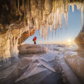 Озеро Байкал, пролив Ольхонские ворота. Здесь спокойствие Малого моря Байкала встречается с мощью и бескрайностью Большого. Когда мы были здесь в середине января, Малое море уже замерзло, а Большое море даже не собиралось: на фотографиях видно лед на переднем плане и открытую воду - на дальнем.