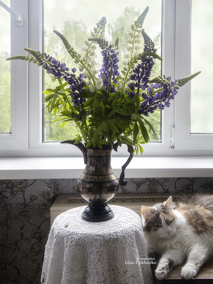 кошки, домашние животные, питомцы, интерьер, цветы, букеты, лето, Приходько Ирина