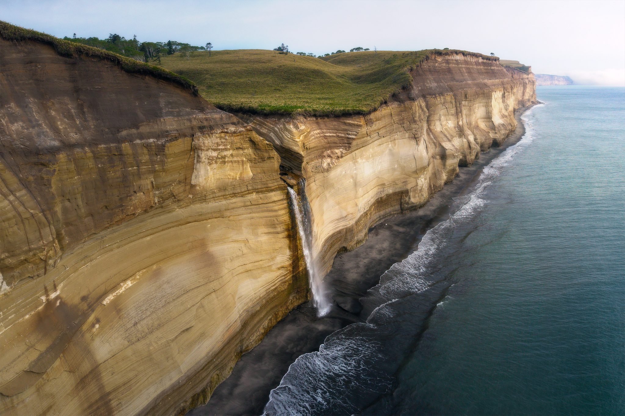 Головнинский клиф - участок обрывистых берегов на тихоокеанской стороне Кунашира. Высота отвесных базальтовых стен достигает 40–50 метров, а в основании видны следы древних вулканических процессов. Добраться сюда можно только по узкой полосе пляжа во время отлива.