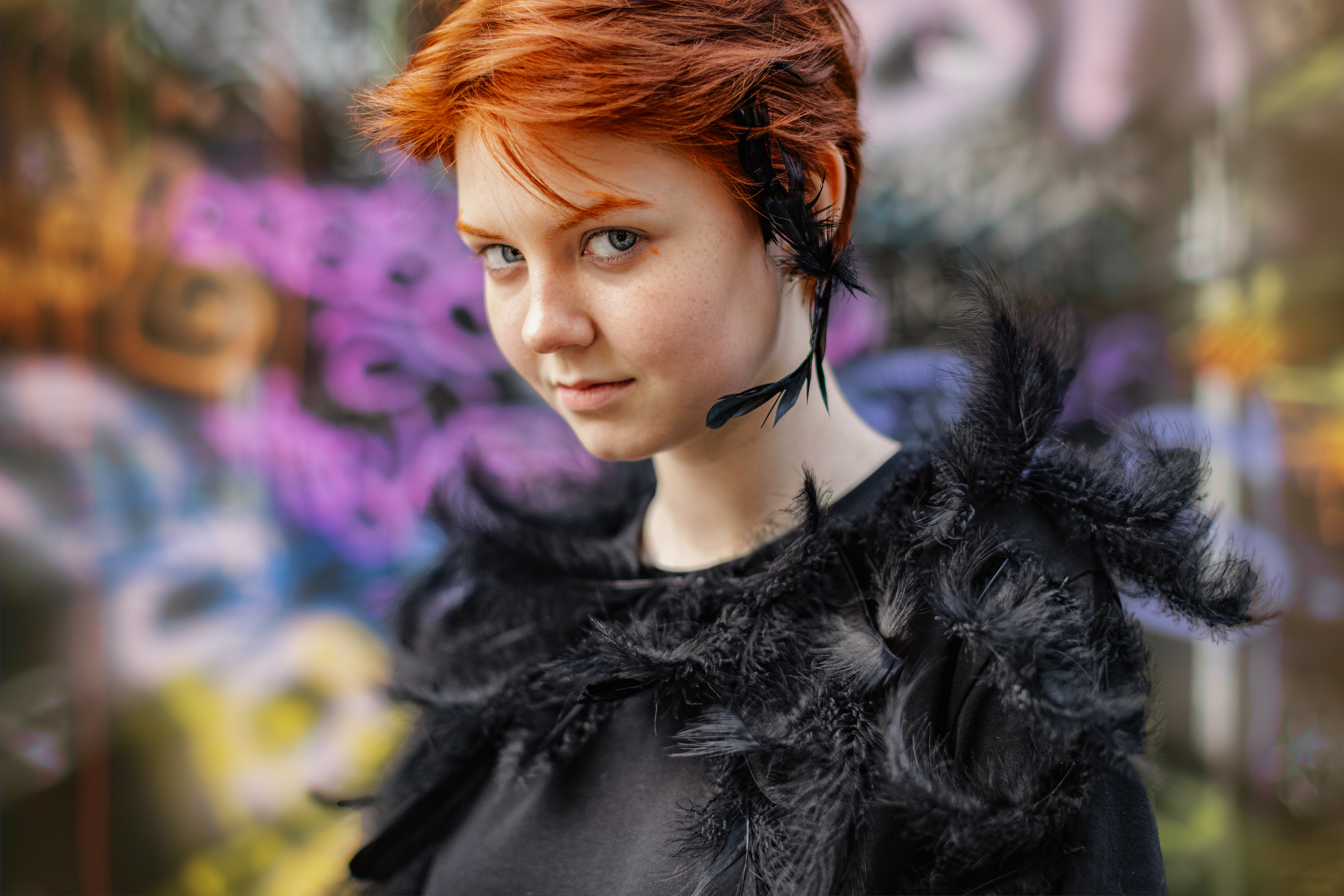 Юная красавица позирует у настенного панно