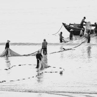 Sau chuyến đánh cá, các ngư dân đang thu gôn lưới